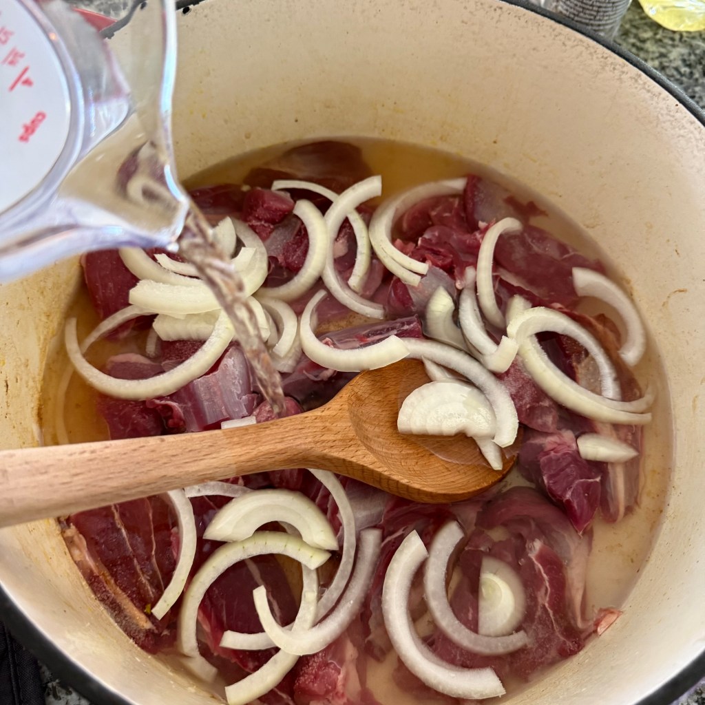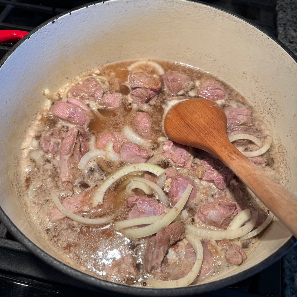 And another thing⦠weāre just putting the lamb straight into a pot of water and not searing it first? Bold move. Iām trying to trust the process, but letās just say I had questions.
